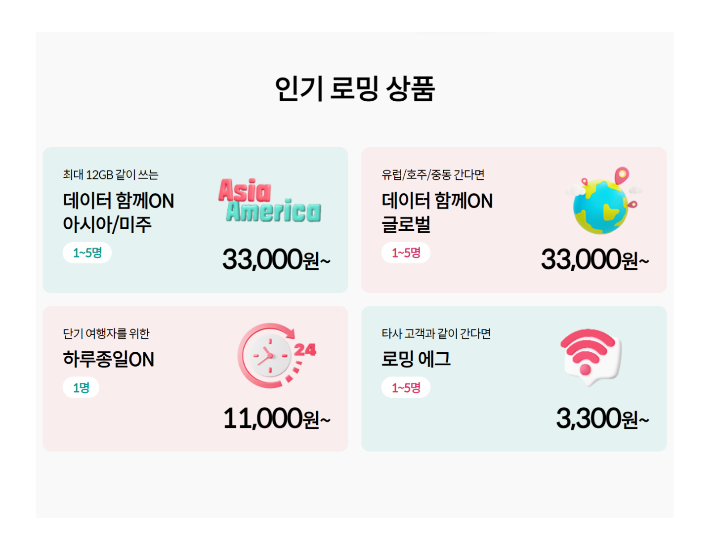 - 타사 통신사를 이용하는 사람들과 데이터 공유가 가능해 비용을 절감할 수 있습니다.