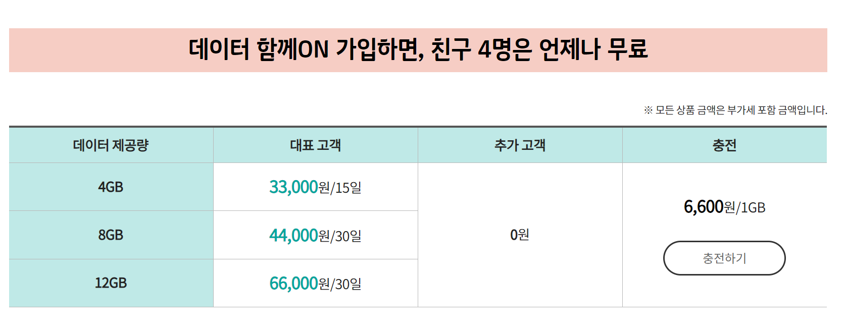 충전 데이터는 '데이터 함께 ON(대표)'고객님만 가입 가능합니다. (최대 3회 충전 가능)