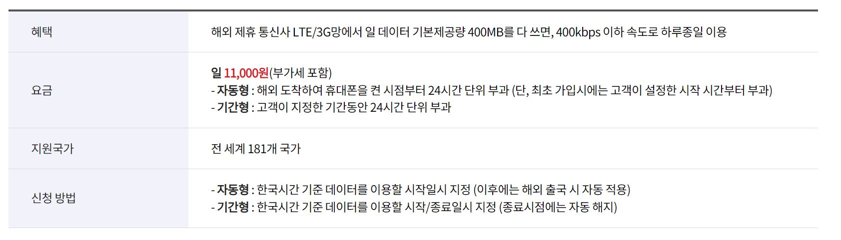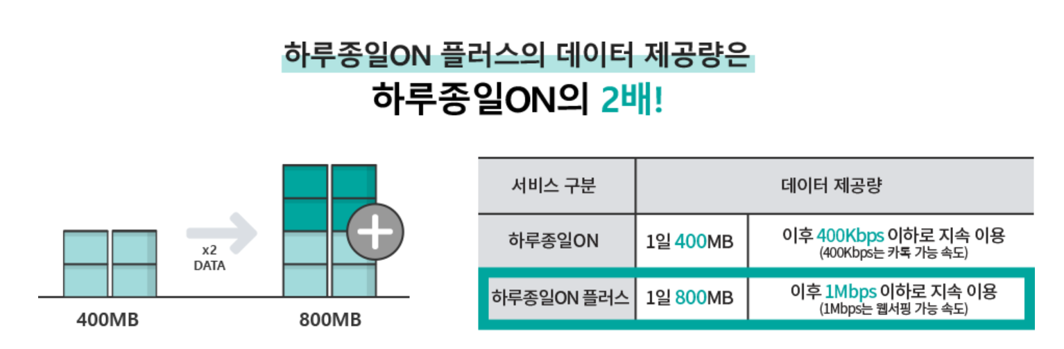 [ 서비스 제공내용 ] 일(24시간) 기준 데이터 400MB + 소진 후 최대 400Kbps의 속도로 무제한 이용 |
