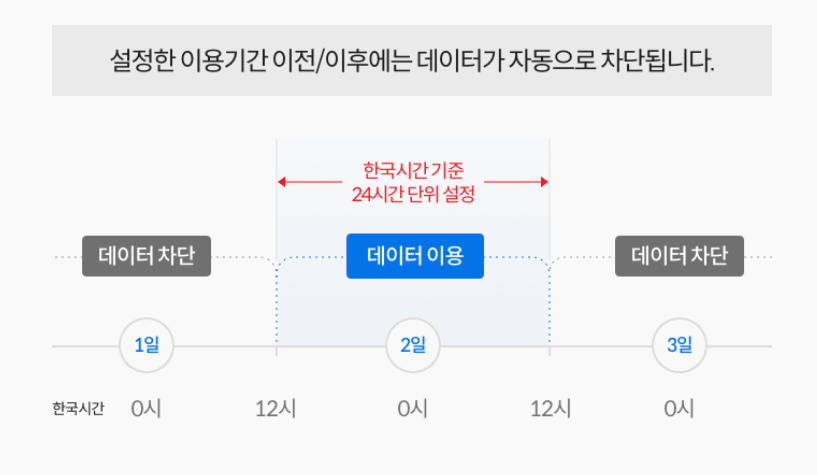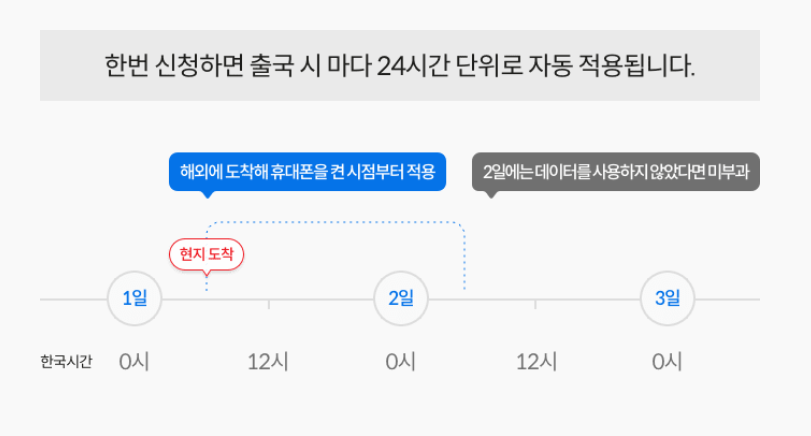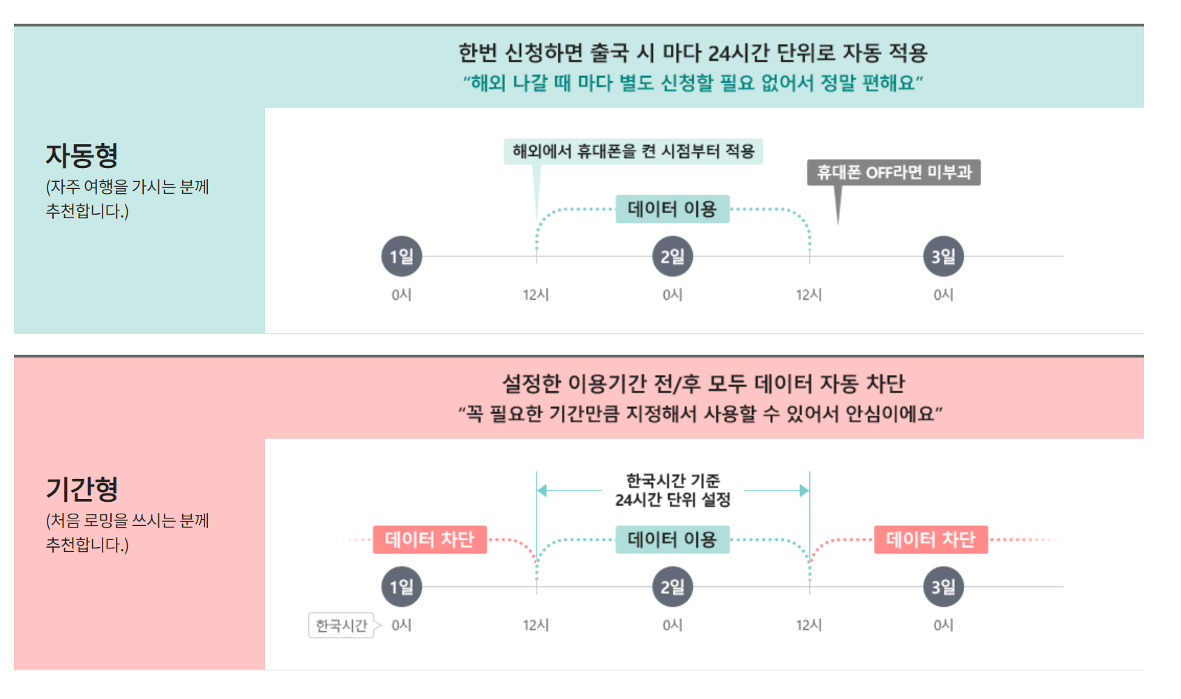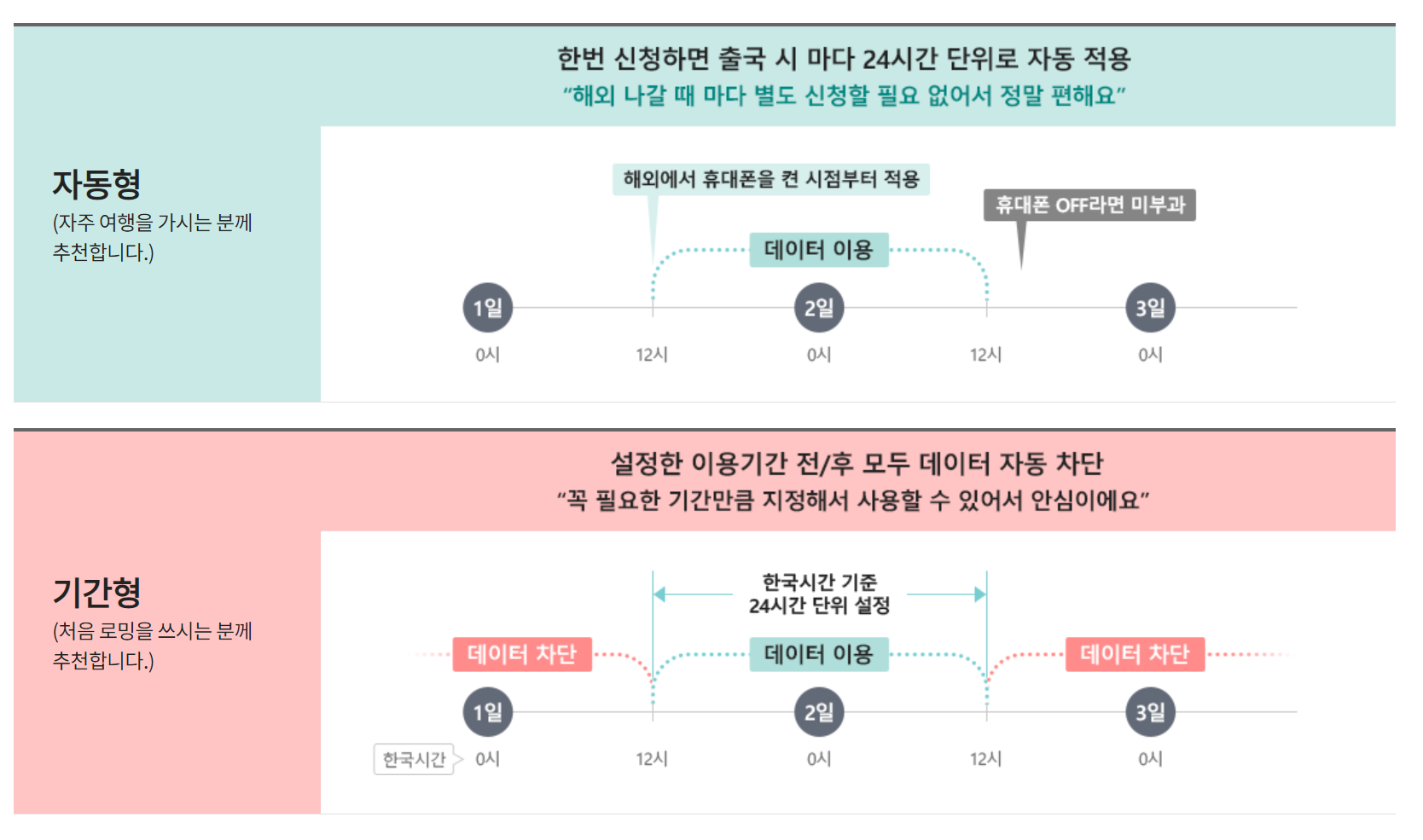[ 서비스 선택유형 ] ※ 로밍 하루종일 ON 부가서비스 는 기간형을 기본제공으로 함 1 기간형 : 고객이 지정한 시간부터(한국시간 기준) 24시간 단위로 1일 요금 부과하며 시작/종료일시를 지정하는 형태 (지정한 종료일시 후 데이터로밍 안심차단 되며 국내 귀국 후 안심차단은 해제됨) ![]() 2 자동형 : 고객이 해외도착하여 휴대폰을 켠 시점부터 24시간 단위로 1일 요금 부과 (단, 최초가입 시에는 고객 설정 시간부터(한국시간 기준) 24시간 단위로 1일 요금 부과) ![]() |