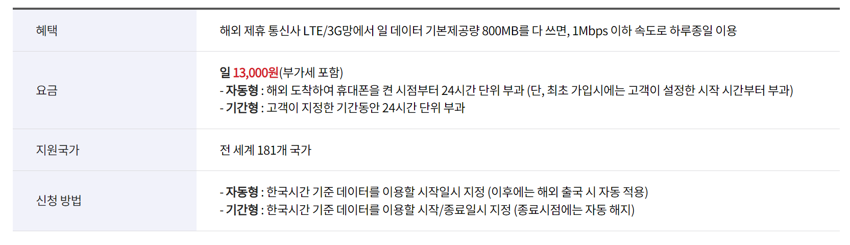 [ 서비스 이용요금(VAT포함) ] - 일(24시간) 기준 13,200원 ※ 데이터 사용이 없는 날의 경우 요금이 과금되지 않습니다 |