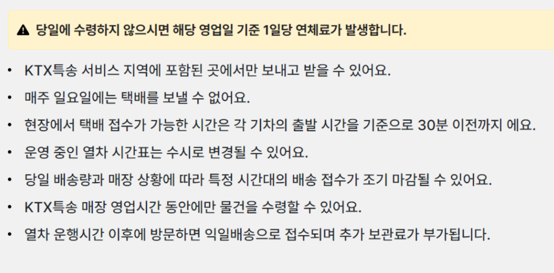 - 전국 KTX 특송 매장 영업시간에만 물건을 찾을 수 있기 때문에 각 매장별 영업시간을 미리 확인해야 합니다.