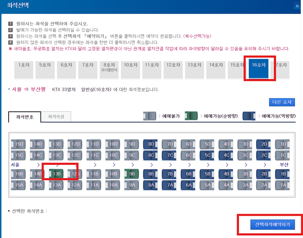(좌석선택에서는 열차 호수를 클릭한후 순방향좌석으로 선택하는게 좋습니다.)