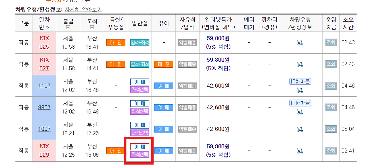 7. 원하는 열차시간을 선택해서 좌석선택을 클릭합니다.