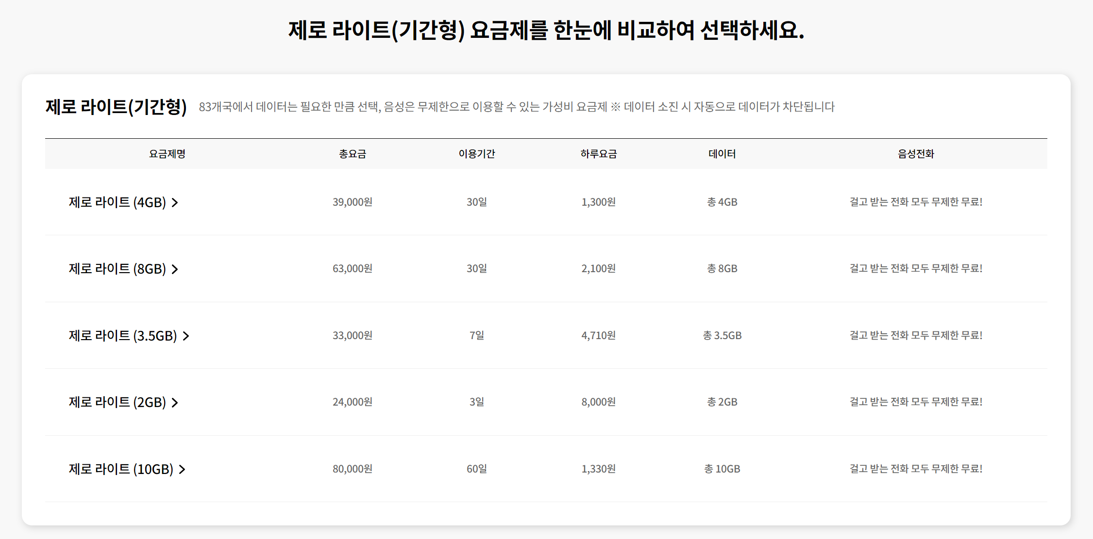 (1) 제로 라이트 30일 (4GB/8GB+무제한 음성)