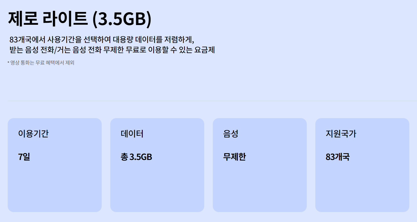 해외 출장이나 여행을 가시는 분들께 7일 기간형으로 구성된 제로 라이트 요금제를 소개해드릴까 합니다. 해외에서도 내 휴대폰 내 번호 그대로 무제한 통화가 가능하고 데이터도 사용할 수 있어 편리하게 해외로밍을 이용할 수 있습니다.
