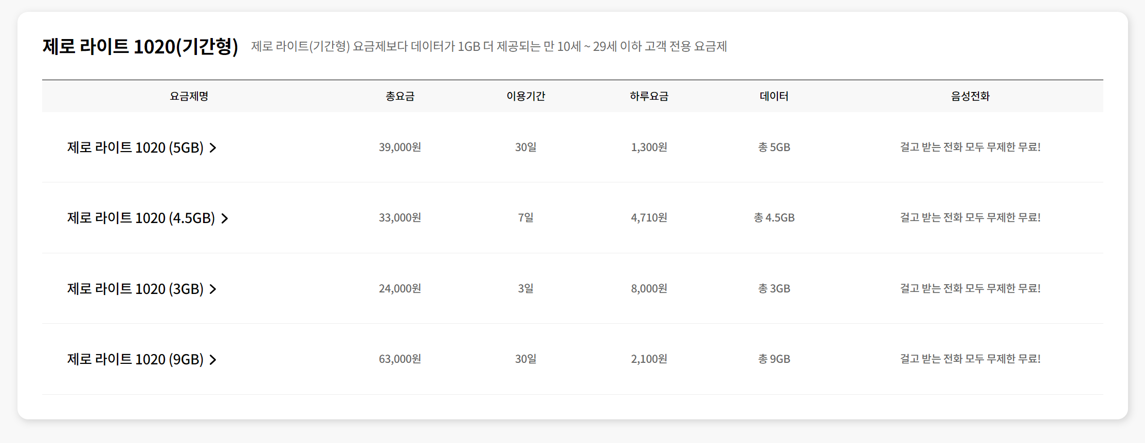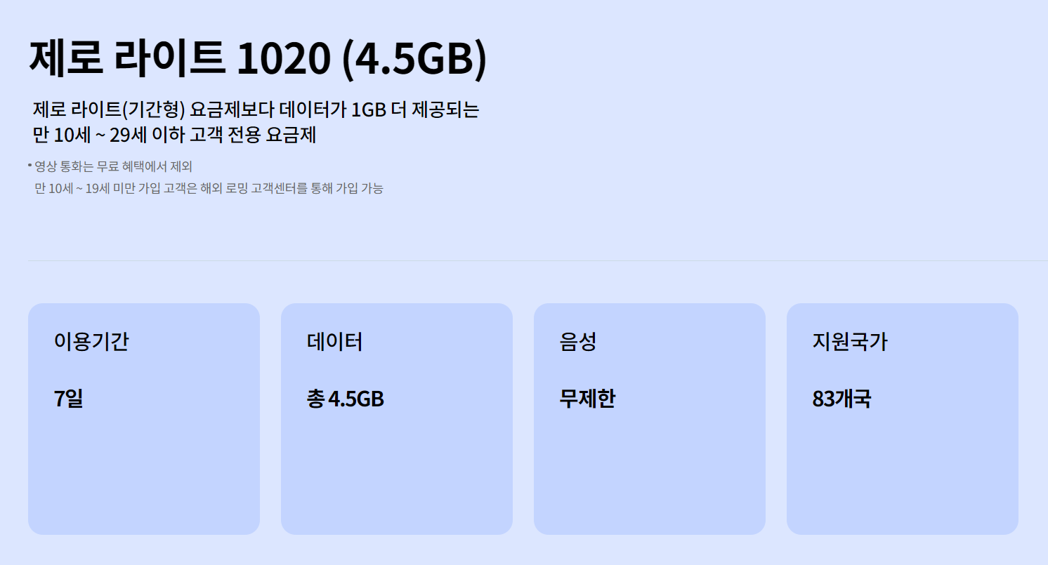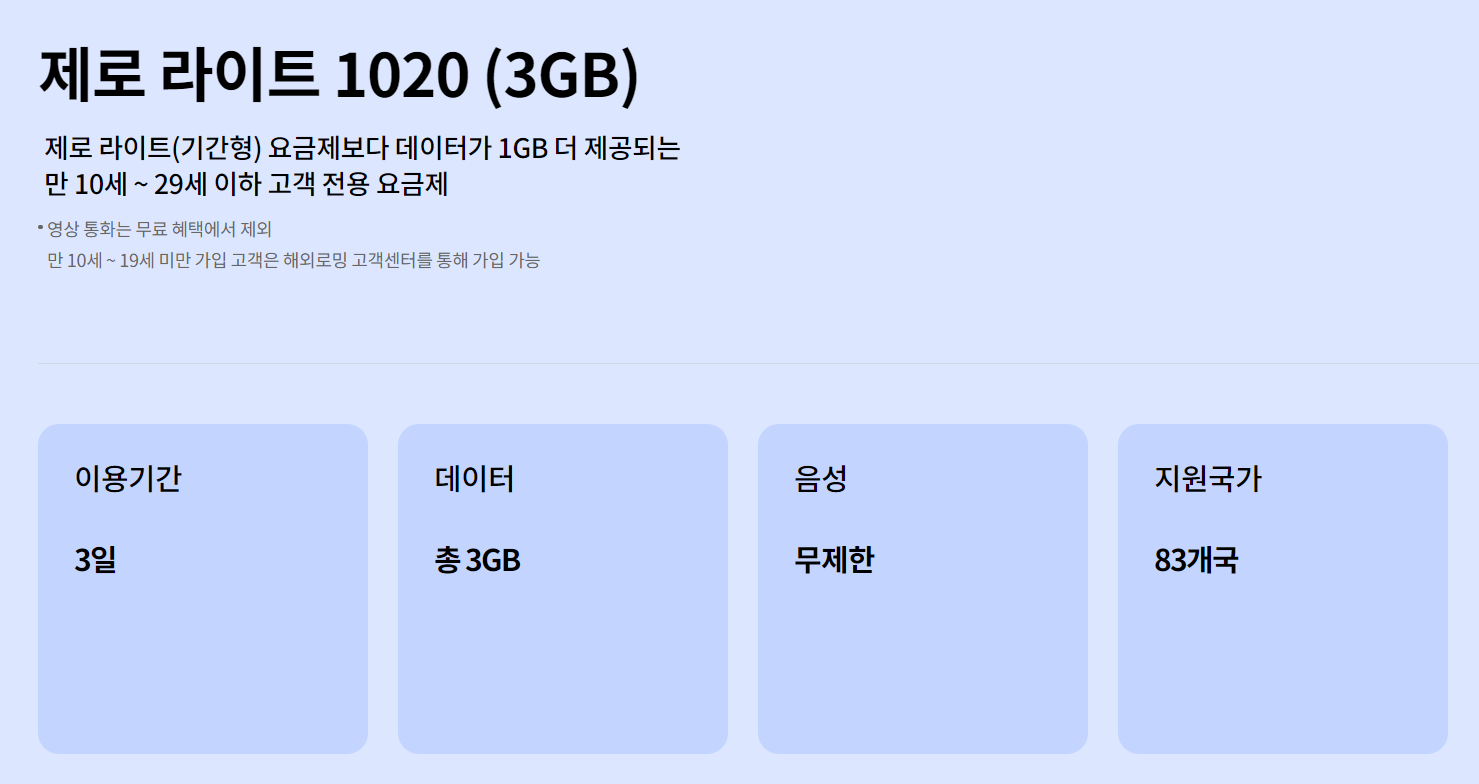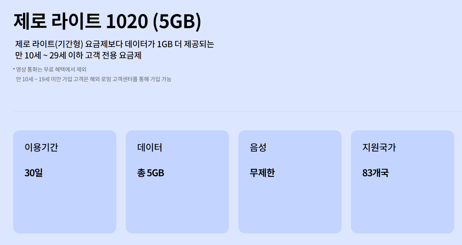 해외 로밍이 필요한데 현재 나이가 10~29라면? 기간선택이 다양하고 1GB 데이터를 무료로 더 받을 수 있는 제로 라이트 1020 요금제를 소개해 드리겠습니다.