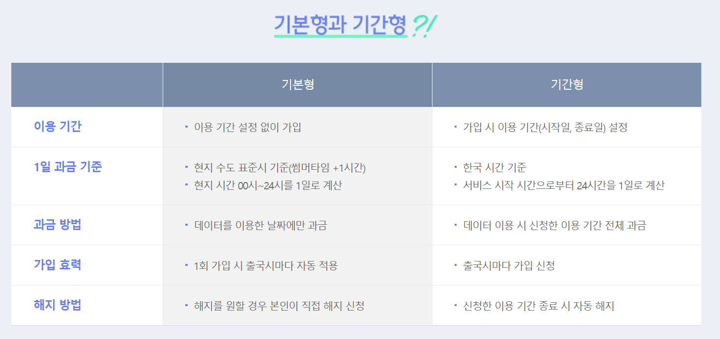 (3) 기본형에 가입하시면 출국 시마다 요금제가 자동 적용되므로 매번 가입할 필요가 없습니다.