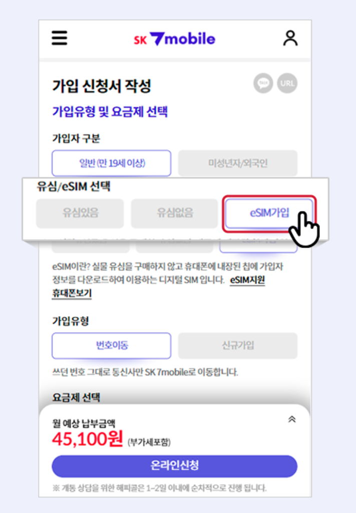 (1) 가입신청서 작성 시, 'eSIM 가입'을 선택하고 신청서를 작성해 주세요.