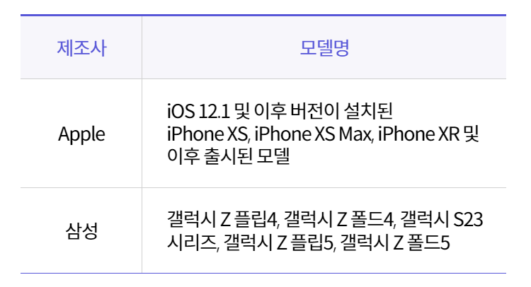 (1) eSIM서비스는 eSIM을 지원하는 휴대폰에 한해 이용이 가능하며, 당사 홈페이지에 기재되어 있지 않은 모델의 경우 제조사를 통해 추가 확인 바랍니다.
