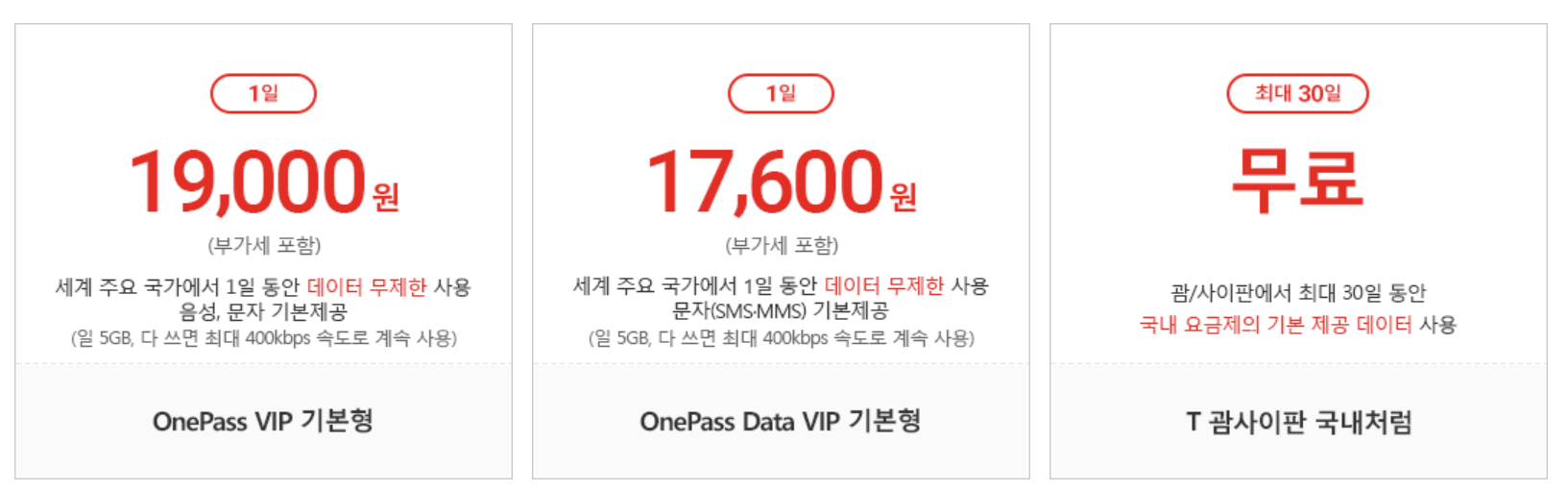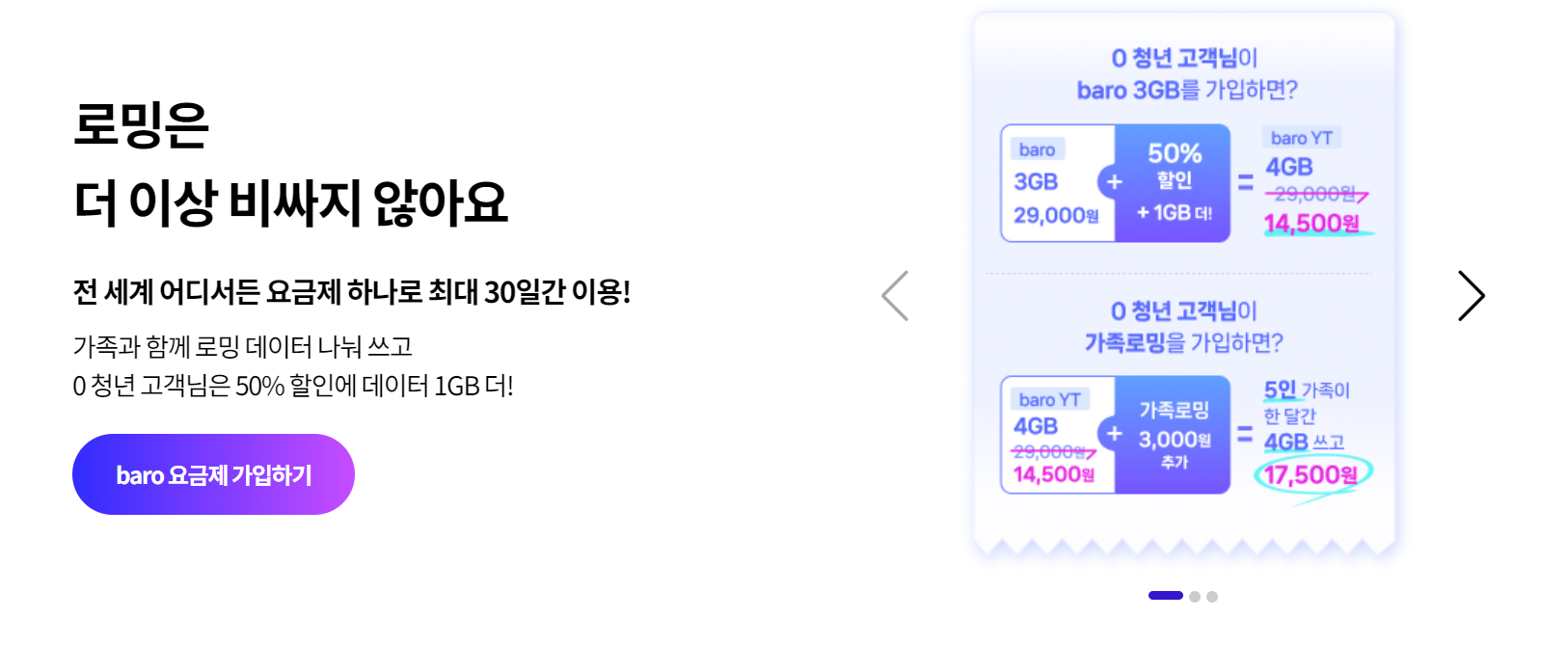 - baro 3/6/12/24GB, 3000원 가족로밍 OnePass 500/VIP/Data VIP 등아래의 로밍 요금제에 가입해 주세요.