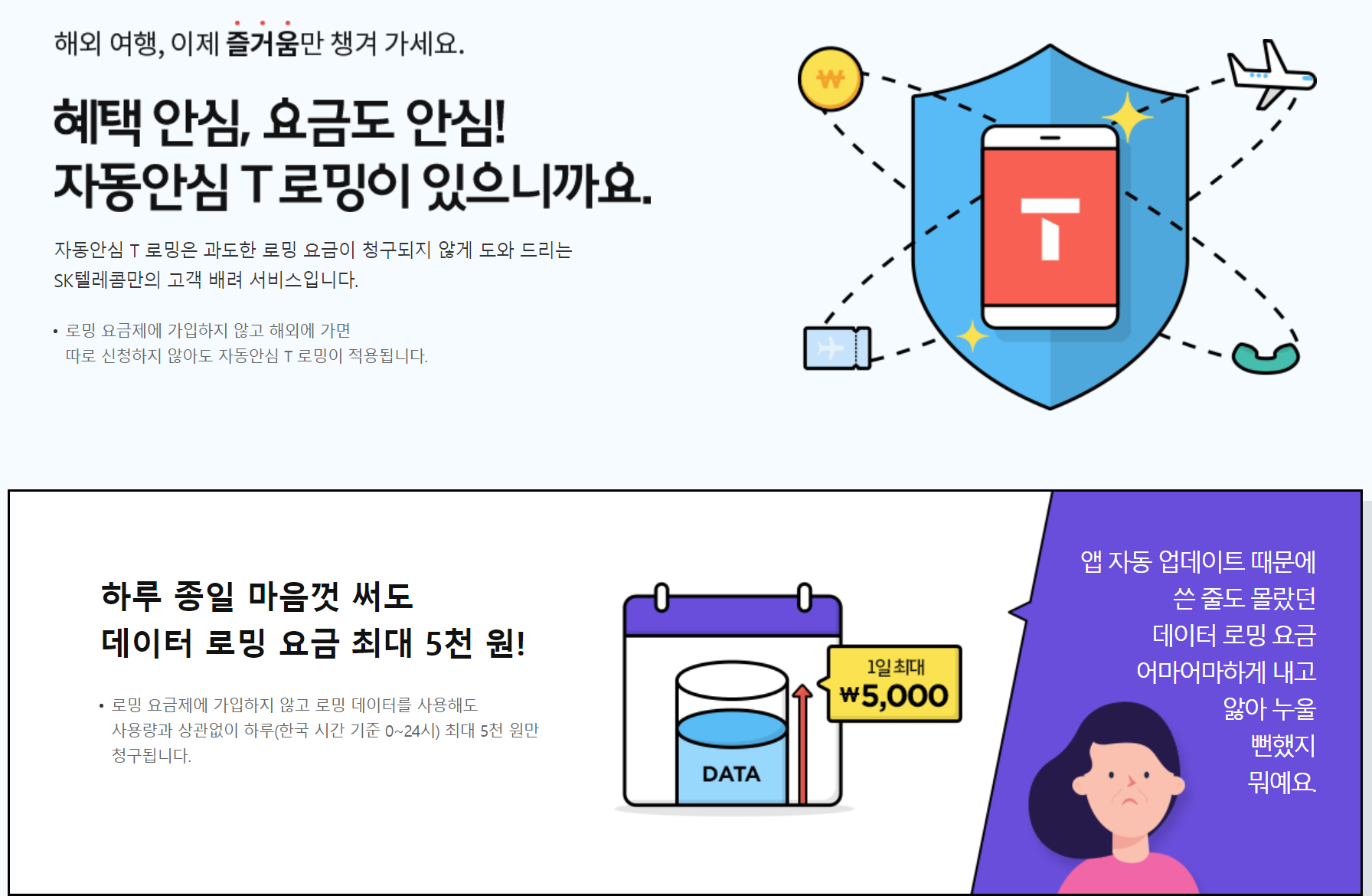 데이터 로밍 요금이 일 5,000원에 도달하면 T 로밍 데이터 안심 서비스에 자동 가입됩니다.